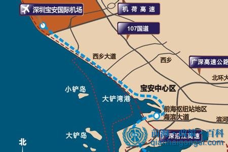 前海規(guī)劃具體范圍圖,包括由裕安路、新湖路、湖濱西路、寶安大道、月亮灣大道、媽灣大道及建設(shè)中的海堤岸線所圍合的陸域范圍,前海周邊輻射地區(qū)包括蛇口半島、后海中心區(qū)、寶安中心區(qū)、大鏟港區(qū)、大鏟島、小鏟島、孖洲島在內(nèi)的陸域及海域片區(qū)等。